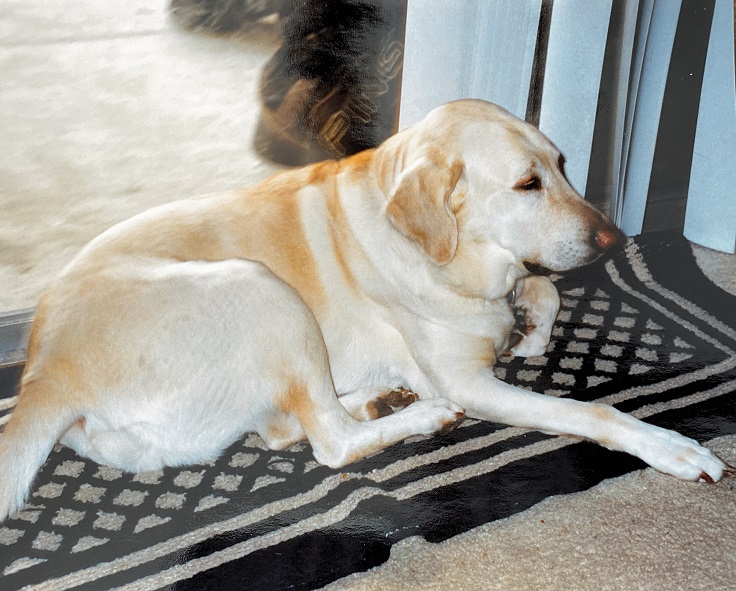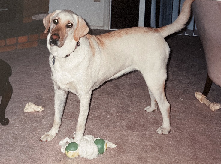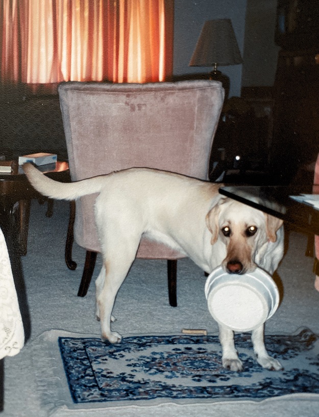 When I bought a house after my divorce, we were a pet free home. But not for long. My daughter was babysitting and one of the neighbors had a litter of Labrador puppies. Of course, she fell in love with them and begged me to let her have one. I had to admit they were cute, and we adopted an little white female we called Kaicee. She was a handful at first, as all puppies are, but she learned quickly and with a lot of training she became one of the best dogs I have ever owned. She was huge… about 100 lbs and mostly white, although her parents were golden Labs.